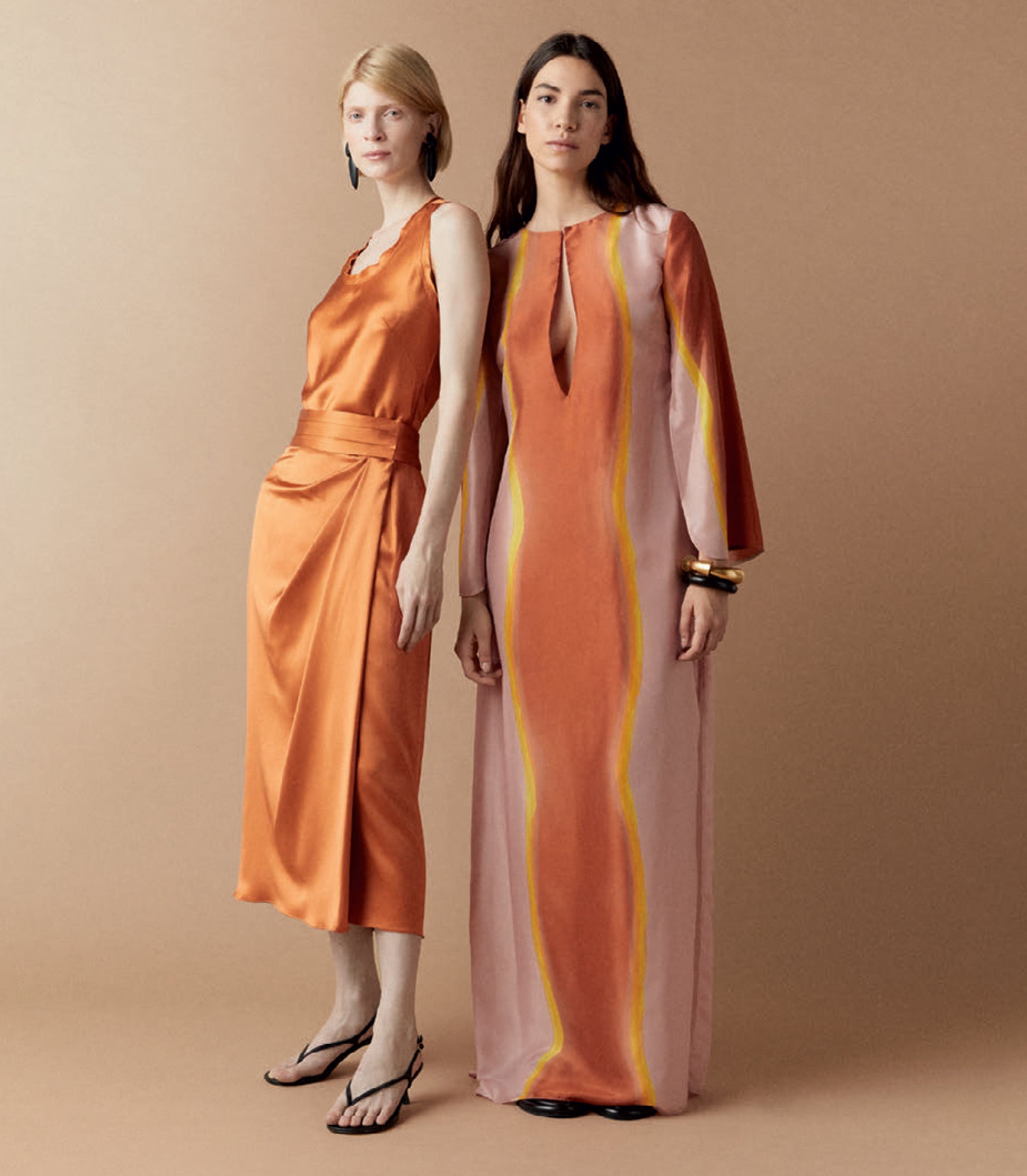 Crida Kaftano in habotai con colori vivaci e accattivanti. La linea dritta è arricchita da maniche ampie che si aprono dal gomito in avanti, mentre la profonda scollatura a goccia, chiusa da un gancetto, dona un tocco sofisticato.
